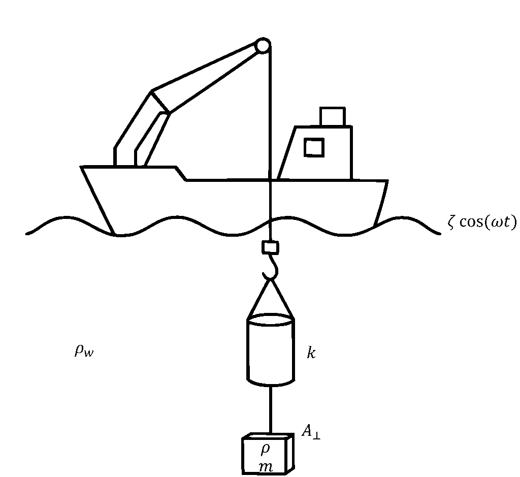Heave means vertical motion, in our context vertical motion of the crane hook, caused by waves. Passive heave compensation can be thought of as a spring-mass-damper system with the objective of reducing wave induced motion below the compensator. The below simplified sketch illustrates our scenario: